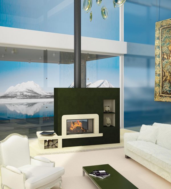 The artisan engineered AxisH1200DS double sided inbuilt wood fireplace is a French panoramic steel firebox with breathtaking sentiments and an unbelievable heating performance. View a spirited display of ambient flames that will dance continuously from this double sided masterpiece all winter long. A personal gallery awaits from any point in the room with the Axis H1200DS double sided inbuilt wood fireplace. The large glass viewing area also gives this French hand made wood heater a luxurious contemporary feel that is much sought-after.