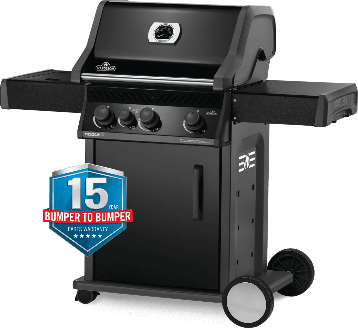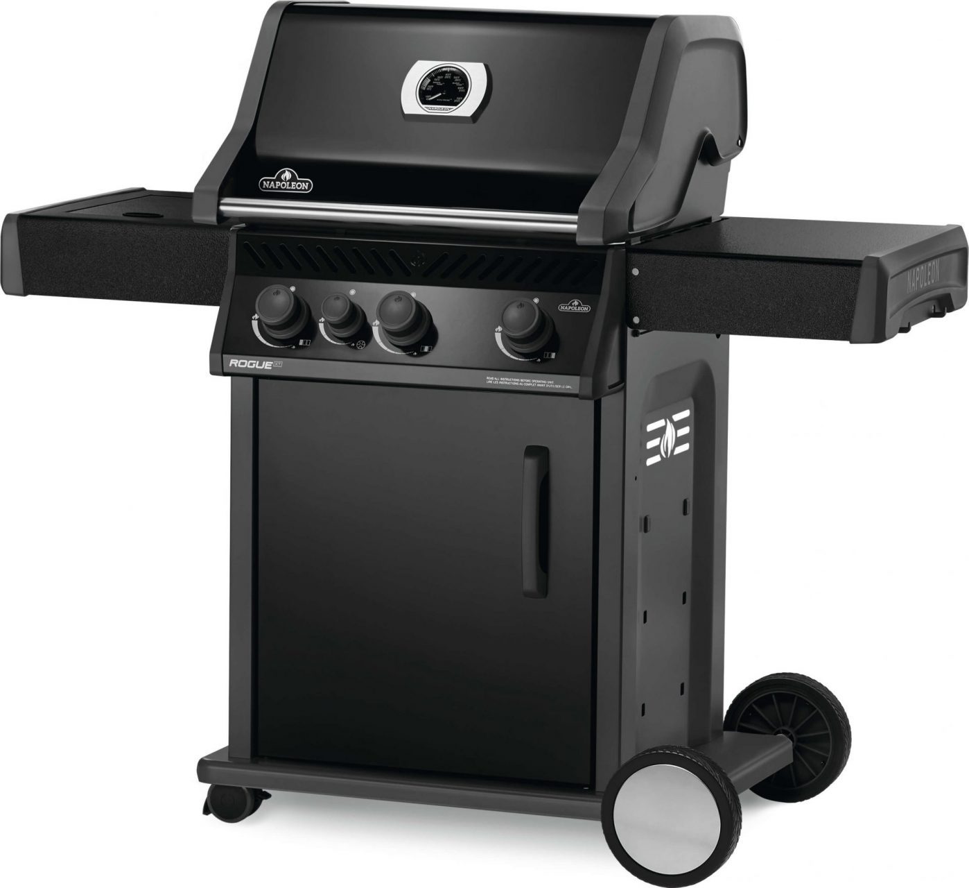 Napoleon’s Rogue® XT 425 Black Hood Propane Gas Grill with Infrared Side Burner has three burners, cast iron grids and a high top lid. This grill lights easily, every time, with a battery-free ignition. Grill the perfect steak using the integrated sizzle zone side burner or use it to make sauces and sides while grilling, and searing on the main area. The durable materials are both stylish and easy to maintain.