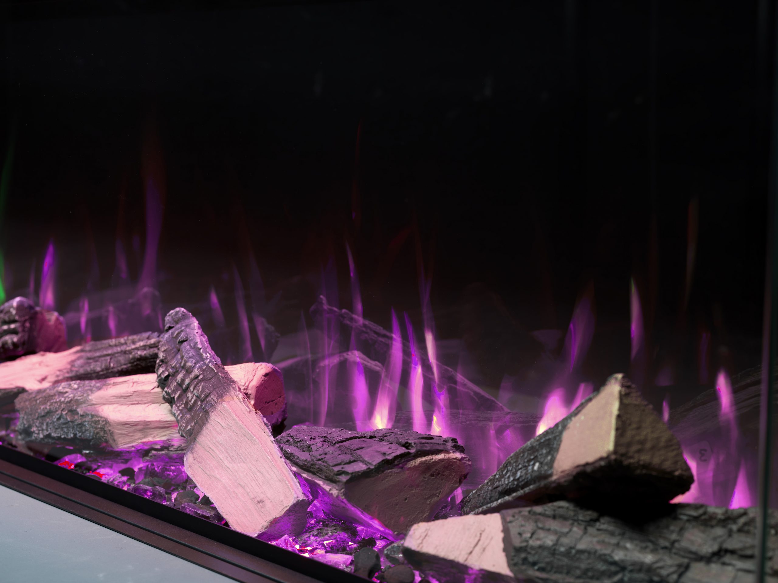 - 3 independently controlled lighting effects Flames – colour & brightness, Under fuel bed – colour & brightness, Above fuel bed – colour and brightness