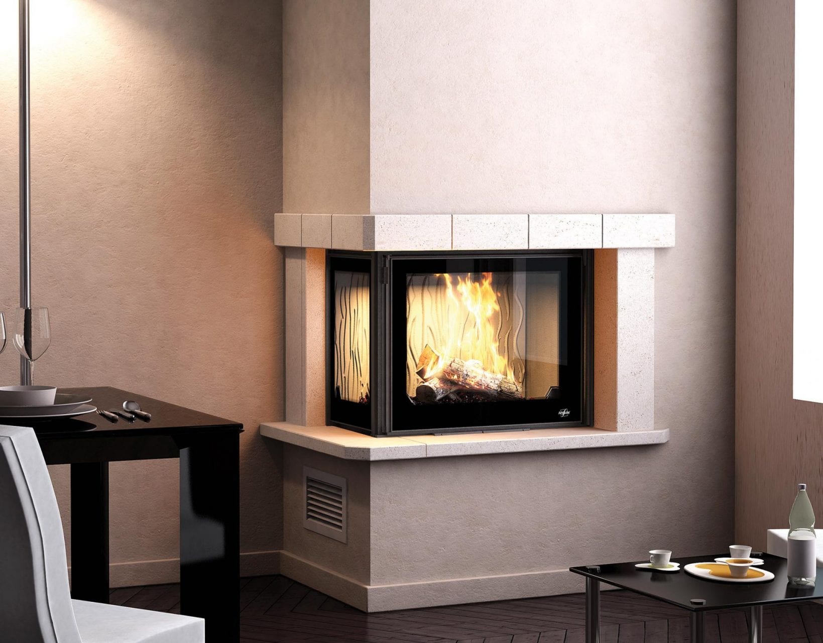Majority of Seguin wood fireplaces are equipped with DAFS technology with the aim to inject oxygen at a determined level inside of the combustion chamber. The supply of new oxygen will burn the gases and smoke that has not yet been burnt and prevent them from being released into the flue system. The advantages of this; a longer fire term, cleaner glass, also total combustion of the fire wood.