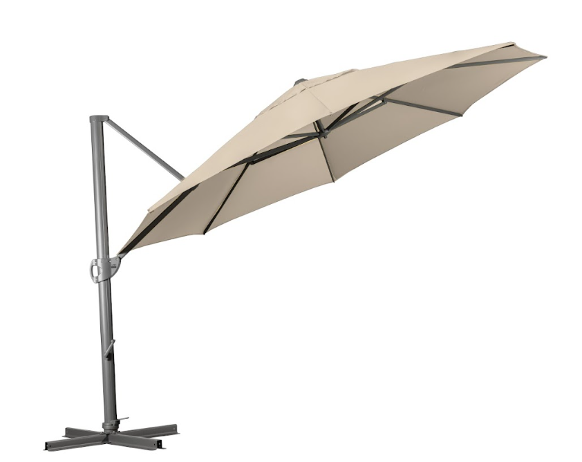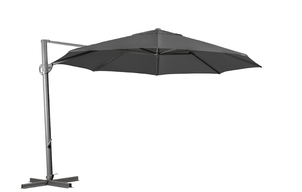 The Shelta Savannah Cantilever Umbrella features a number of design innovations, including a drop-down bracket on the umbrella hub for LED light attachment. Most importantly, the Shelta Savannah is covered in O’bravia solution dyed canvas – a fabric that has legendary fade-resistant properties, exceeded only by Sunbrella acrylic. Savannah has an impressive oval section mast and a 360˚ rotate (with foot lock), press button tilt lock, crank lift opening and resin base options. Includes Protective Cover.
